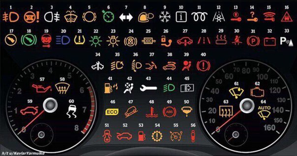 — Значения значков на приборной панели авто:- Вам знакома такая ситуация: на приборной панели вдруг начинает мигать какой-то символ, которого вы никогда раньше не видели? И вы понятия не имеете, что он означает? Спрашивать как-то неудобно, да и не у кого. Срочно ли это? Можно ли отложить до завтра? Может, вызвать экстренную помощь? Показать полностью…Итак, приступим: 1. Противотуманные фары (передние). 2. Неисправность усилителя рулевого управления. 3. Противотуманные фары (задние). 4. Низкий уровень жидкости стеклоомывателя. 5. Износ тормозных колодок. 6. Значок включённого круиз-контроля. 7. Включены поворотные сигналы. 8. Датчик дождя и света. 9. Зимний режим. 10. Индикатор информационного сообщения. 11. Индикация работы свечи накаливания. 12. Мороз. 13. Индикация обнаружения бесконтактного ключа. 14. Ключ не обнаружен. 15. Батарея ключа нуждается в замене. 16. Опасное сокращение дистанции. 17. Нажмите педаль сцепления. 18. Нажмите тормозную педаль. 19. Блокировка рулевой колонки. 20. Дальний свет. 21. Низкое давление в шинах. 22. Индикатор включения наружного освещения. 23. Неисправность наружного освещения. 24. Не работает стоп-сигнал. 25. Предупреждение сажевого фильтра. 26. Предупреждение прицепного устройства. 27. Предупреждение пневматической подвески.28. Смена полосы движения. 29. Перегрев катализатора. 30. Не пристёгнут ремень безопасности. 31. Активирован стояночный тормоз. 32. Неисправность аккумулятора. 33. Система помощи при парковке. 34. Требуется техническое обслуживание. 35. Адаптивные передние фары. 36. Неисправность автоматического наклона фар. 37. Неисправность заднего спойлера. 38. Неисправность крыши в кабриолете. 39. Ошибка подушки безопасности. 40. Неисправность ручного тормоза. 41. Вода в топливном фильтре. 42. Подушка безопасности деактивирована. 43. Неисправность. 44. Фары ближнего света. 45. Загрязнение воздушного фильтра. 46. Режим экономии топлива. 47. Система помощи спуска с горы. 48. Повышенная температура. 49. Неисправность антиблокировочной системы тормозов. 50. Неисправность топливного фильтра. 51. Открыта дверь. 52. Открыт капот. 53. Низкий уровень топлива. 54. Неисправность автоматической коробки передач. 55. Автоматический ограничитель скорости. 56. Амортизаторы подвески. 57. Низкое давление масла. 58. Обогрев лобового стекла. 59. Открыт багажник. 60. Система стабилизации отключена. 61. Датчик дождя. 62. Неполадка двигателя. 63. Обогрев заднего стекла. 64. Автоматическое очищение лобового стекла.#полезное@autobapПодпишись и следи за обновлениями: vk.com/autobap